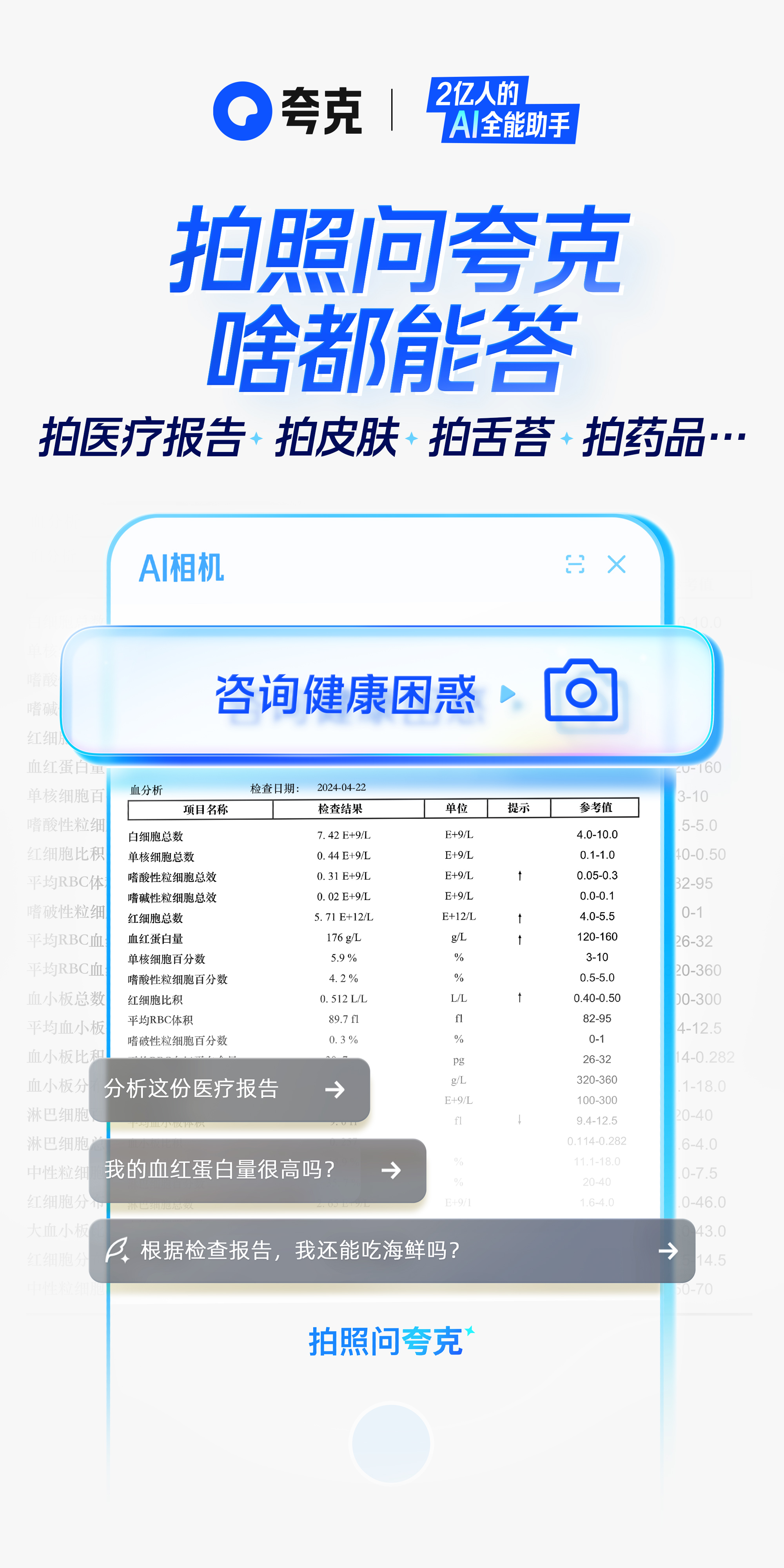 旅行中,“拍照问夸克”化身“专业导游”,边逛边拍获取文物讲解、景点攻略;工作中,它能辅助分析数据图表、优化代码逻辑,生成工作总结文档;在健康领域,上传体检报告,它给出指标异常分析以及康复方案建议。娱乐场景中,它支持棋牌指导、截图找剧、情头配对等趣味功能,并能一键完成高清化、去水印、原文溯源等。此外,“拍照问夸克”还支持多种语言提问和翻译解读。