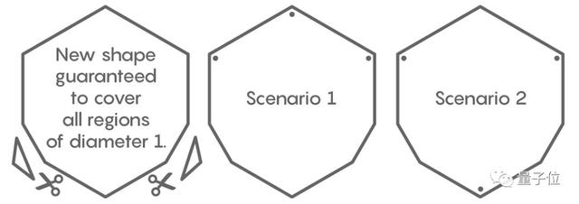 他从他的六边形上切下两个三角形,得到一个保证能覆盖所有直径为1的区域的新形状。