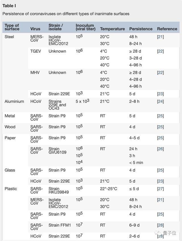 几位来自德国的学者搜索了大量前人的研究,将过去包括SARS、MERS在内的多种病毒存活时间、杀灭条件进行了统一汇总。