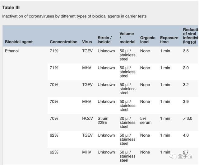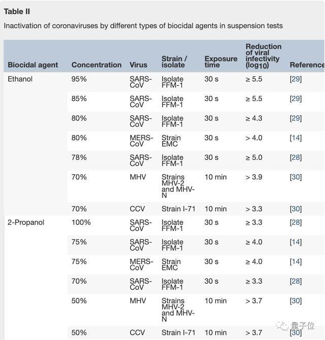 可以从表中看出,在78%浓度以上的酒精中,SARS病毒在30秒后就会迅速灭活。在95%的酒精中,30秒后,病毒传染性降低5.5个数量级。