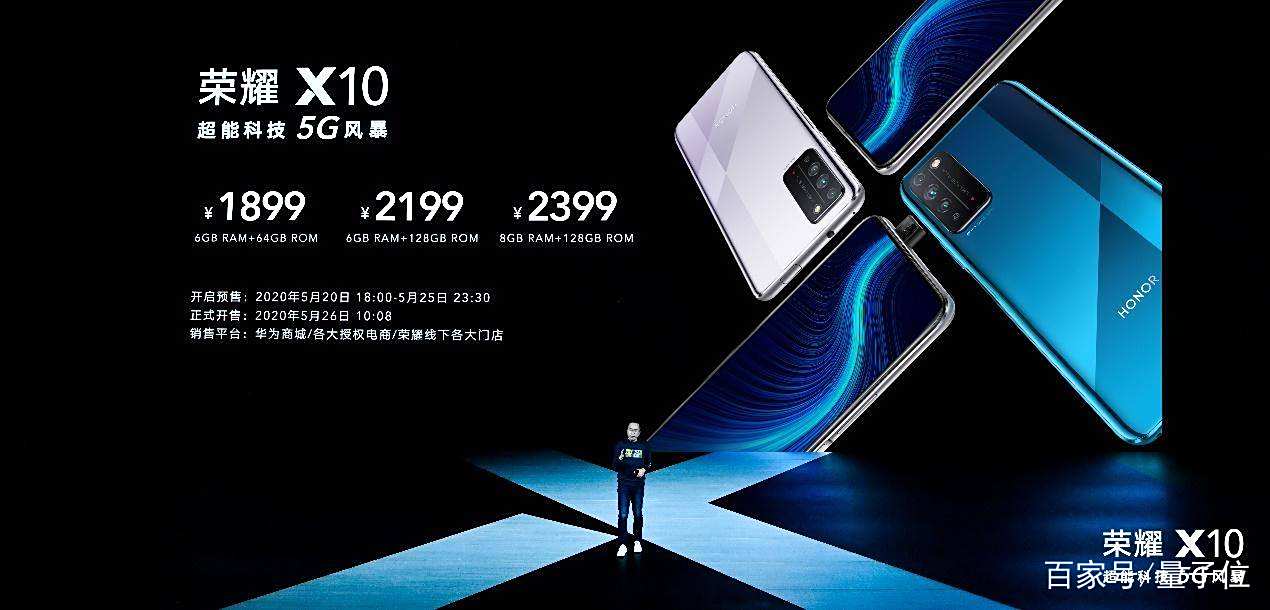 荣耀X10以6GB+64GB版本1899元,6GB+128GB版本2199元,8GB+128GB版本2399元首发价格开售,发布会后即刻开启全平台预售,5月26日将在华为商城、各大授权电商平台、荣耀线下各大门店正式开售。