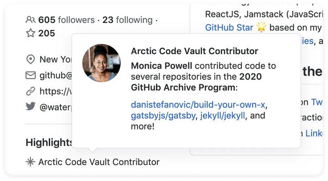 为了表彰这些程序员们,GitHub还设计了荣誉徽章。只要鼠标在开发者主页资料介绍部分悬停,就能看到有哪些项目被放到了北极。