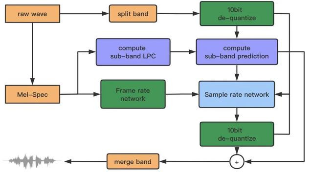 采用多子带并行建模预测方法。首先将音频分割为多个sub-band音频,然后在建模过程中针对每个子带选择不同的训练方式和采样参数,并且降低模型输出混合分布数量。