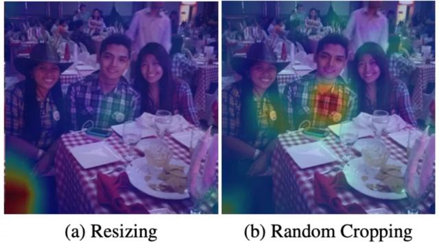 而在使用随机剪裁之后,研究人员得到的新的热图,则更关注来自于图片中物体本身的线索。