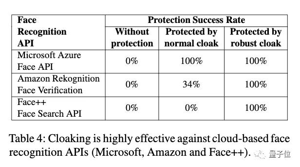 在Microsoft Azure Face API、Amazon Rekognition和旷视Face Search API这几个最先进的人脸识别服务面前,Fawkes的「隐身」效果则达到了100%。