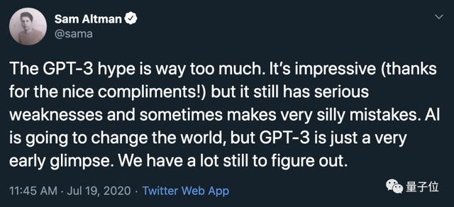 面对网友的赞美,OpenAI的CEO倒是非常谨慎,他认为现在关于GPT-3的炒作实在太多了。GPT-3仍然存在严重缺陷,有时候会犯一些低级的错误,还有很多需要改进的地方。