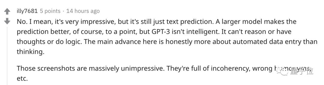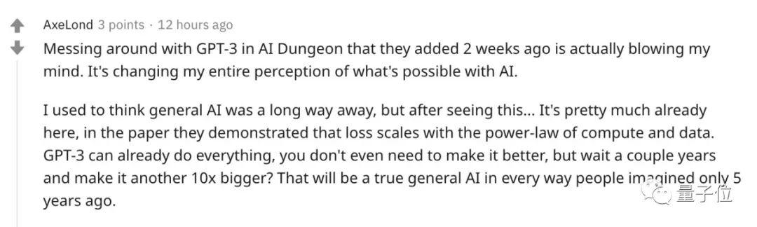 有reddit网友认为,GPT-3的出现证明了通用人工智能不会太遥远。GPT-3已经做了可以做的一切,我们甚至不需要做得更好,只要再等几年,等算力增强,把数据集再扩大10倍。