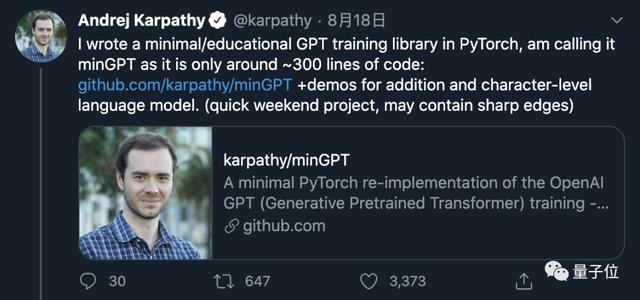 无论是当年的CS231n课程还是他的GitHub项目,都有很高的人气。如此大牛的人物,他写的GPT代码你不去看看吗?