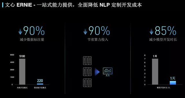 吴甜表示,文心全面降低了 NLP 定制开发成本,能减少90%的数据标注量,节约90%的算力投入,减少85%的模型开发时长。
