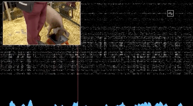 可以看到小猪在吃东西时,其芯片实时传输的脑电波数据,根据不同的峰值来分析小猪的脑部活动。