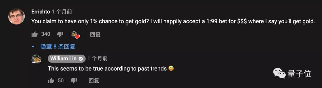 这段视频一直没有什么热度,直到去年他获得过IOI银牌后,才收获了第一条回复。