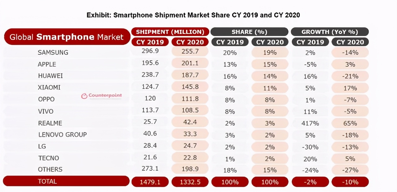 此外,相比三星、苹果、华为和小米,realme公司在2020年以65%的年增长率,成为增长最快的公司。除了realme,其他公司基本呈现负增长,最高增长率也不超过20%。