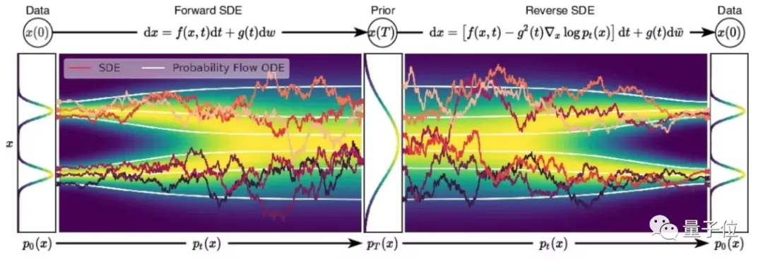 论文提出了一种基于随机微分方程(SDEs)的分数式生成模型框架。其中,SDE通过缓慢注入噪声,平稳地将一个复杂的数据分布转换为一个已知的先验分布,相应的逆时SDE通过缓慢去除噪声将先验分布转换回数据分布。