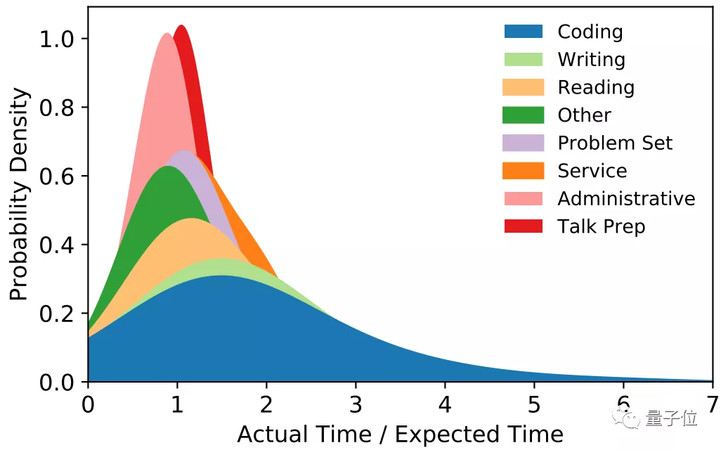 从下图中来看,管理任务和演讲准备几乎100%能准时完成,然而编程和码字,准时完成的概率却依旧很低。