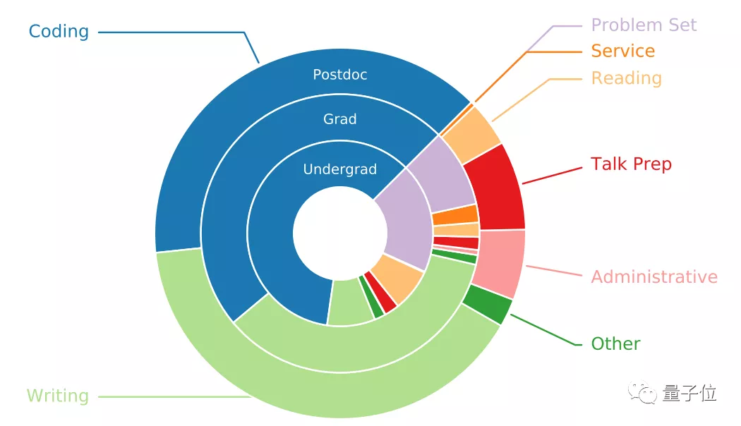 从下图中来看,本科生虽然编程量大,但码字、写论文的任务却相对最少,也比较轻松。