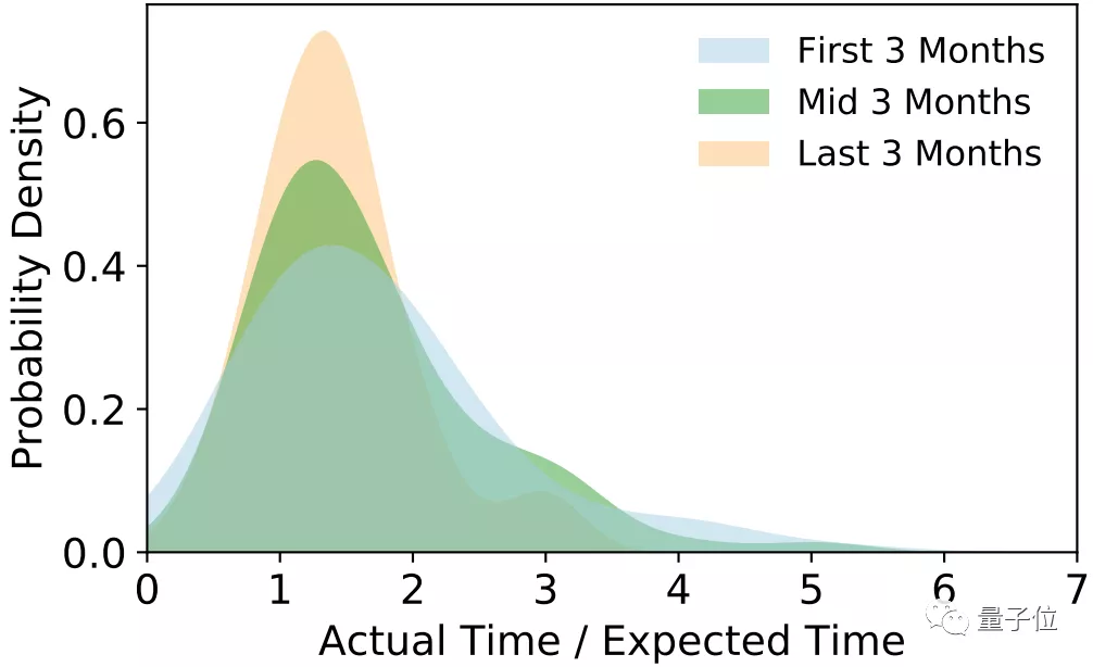 作者又统计了这9个月的最初三个月、中间三个月和最后三个月,能按时完成任务的概率。