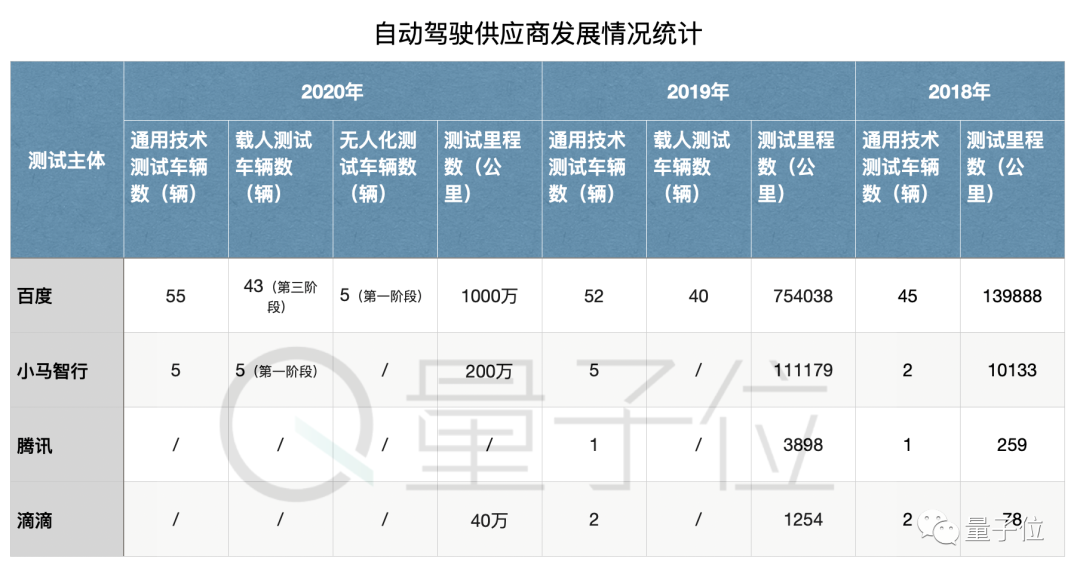 其中,小马智行和文远知行数据分别为超过200万、超过100万公里,百度以1000万公里路测领先。