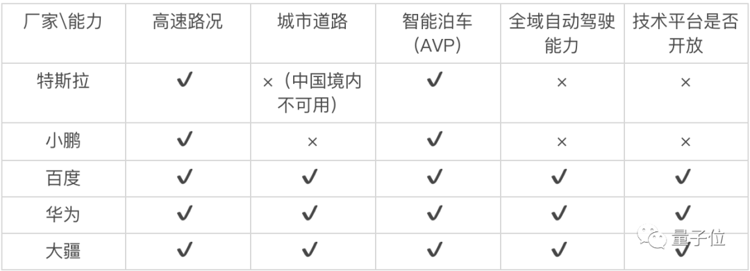 同样,各家自动驾驶能力上,各有侧重跟不同: