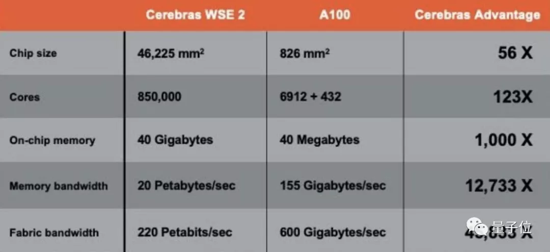 比起英伟达的A100,WSE-2多了2.55万亿个晶体管;内核数是A100的123倍;缓存是其1000倍;可提供的内存带宽,则达到了A100的13万倍