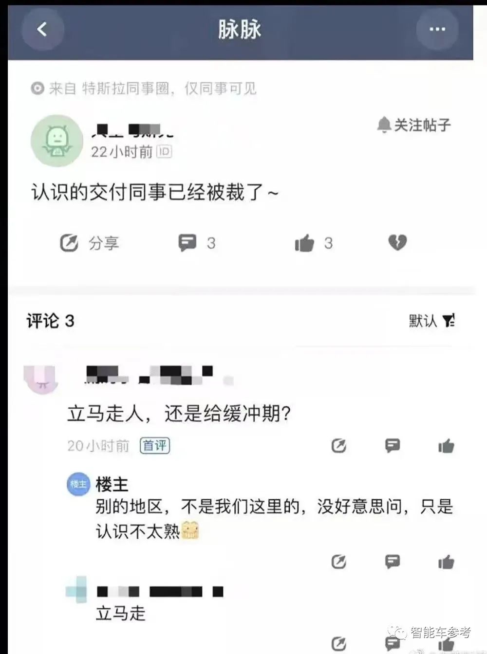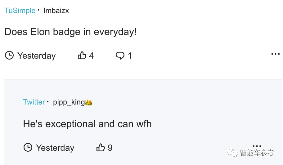 两条匿名帖子,发在国外职场社交网站Blind上,均来自特斯拉员工。