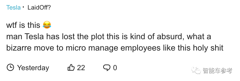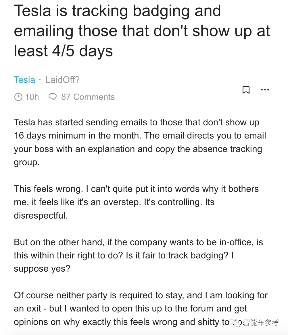 另一条帖子里,特斯拉员工对这一出勤到岗“新规”提出强烈控诉: