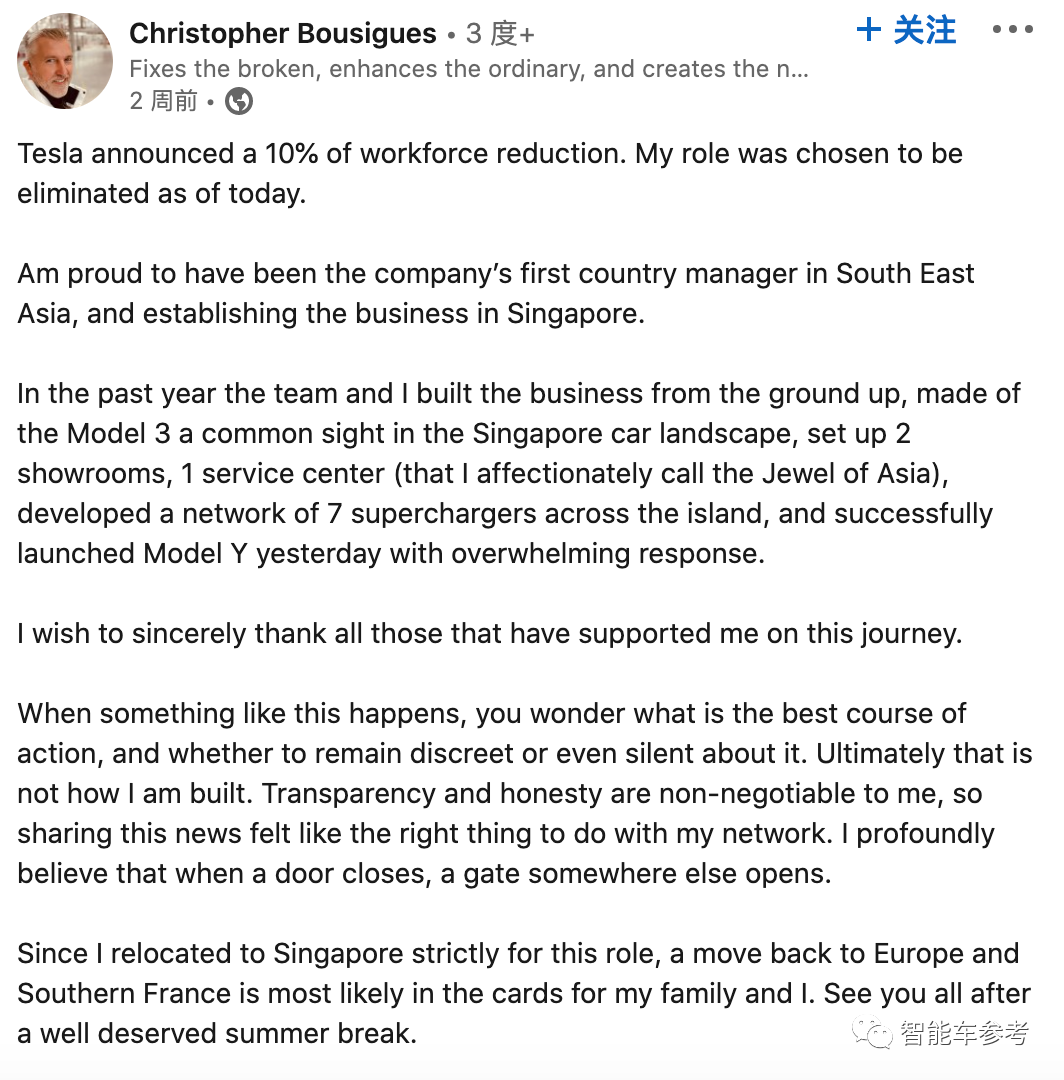 比如特斯拉新加坡地区经理Christopher Bousigues,被裁后简单回首了一番自己的功绩: