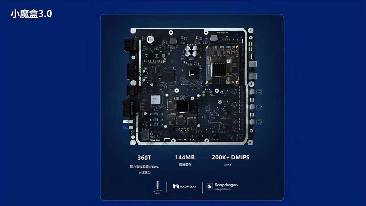 ICU3.0又被称为“小魔盒3.0”,该平台采用5nm高通骁龙8540和7nm高通骁龙9000芯片,单板算力达360TOPS,可持续升级到1440TOPS,平均功耗为5.5TOPS/W。