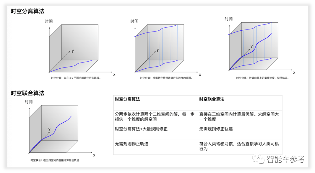 同时考虑空间和时间来规划轨迹,而不是先单独求解路径,在路径基础上再求解速度从而形成轨迹。将「横纵分离」,升级为「横纵联合」,能直接在x-y-t(即平面和时间)三个维度的空间中直接求解最优轨迹。