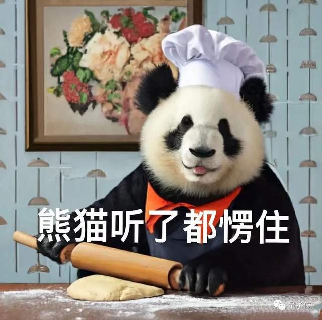本文开头放的熊猫震惊表情包,就是朝Imagen输入“一只非常快乐的毛茸熊猫打扮成了在厨房里做面团的厨师的高对比度画像,他身后的墙上还有一幅画了鲜花的画”后,得出的一张要素完备的AI生成画作。