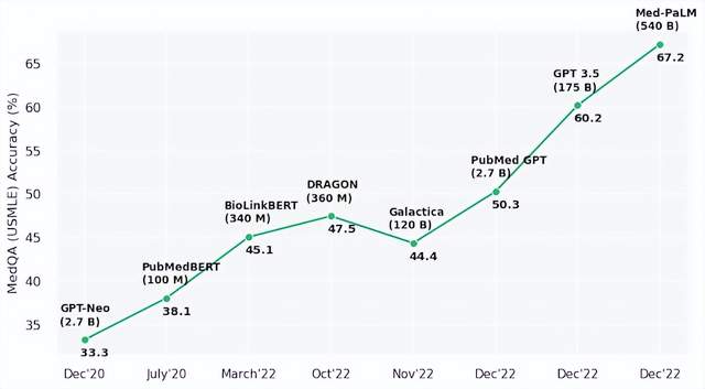 我们的 Med-PaLM 模型在 MedQA USMLE 数据集上获得了最先进的性能,比之前的最好成绩高出 7%。