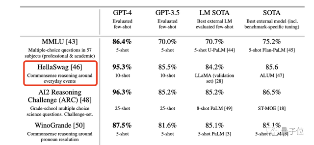 HellaSwag的内容主要是常识推理,这就和GPT-4发布时宣布的“已经达到了人类的常识水平”相匹配。