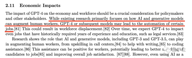 虽然现有的研究主要集中在人工智能和生成模型如何给人类加buff,但GPT-4或后续模型可能会导致某些工作的自动化。