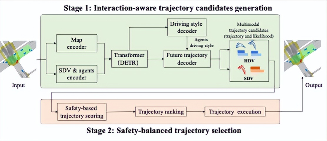 该论文针对高动态的不确定性路口场景,考虑周围人类驾驶车辆(HDVs)的驾驶风格,提出了一种两阶段自动驾驶车辆(SDVs)轨迹规划算法。
