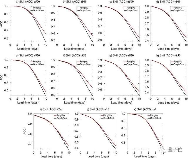 下图对不同大气变量的预测结果。ACC是用于衡量预测结果有效性的指标,数值越高,预测结果越有效(红线代表“风乌”,黑线代表GraphCast)。