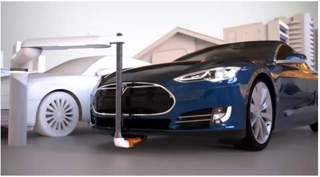 2015年,特斯拉就搞了一款蛇形自动充电桩,安装在固定车位旁,可以自动插接充电。