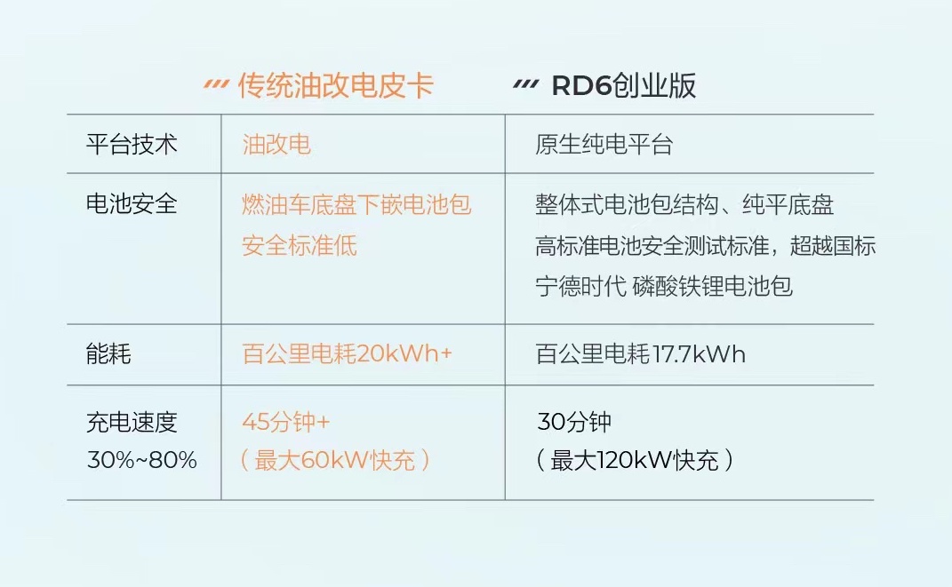 雷达RD6创业版,让用户以燃油皮卡的价格,享受真正的纯电皮卡,享受“真乘用化”。