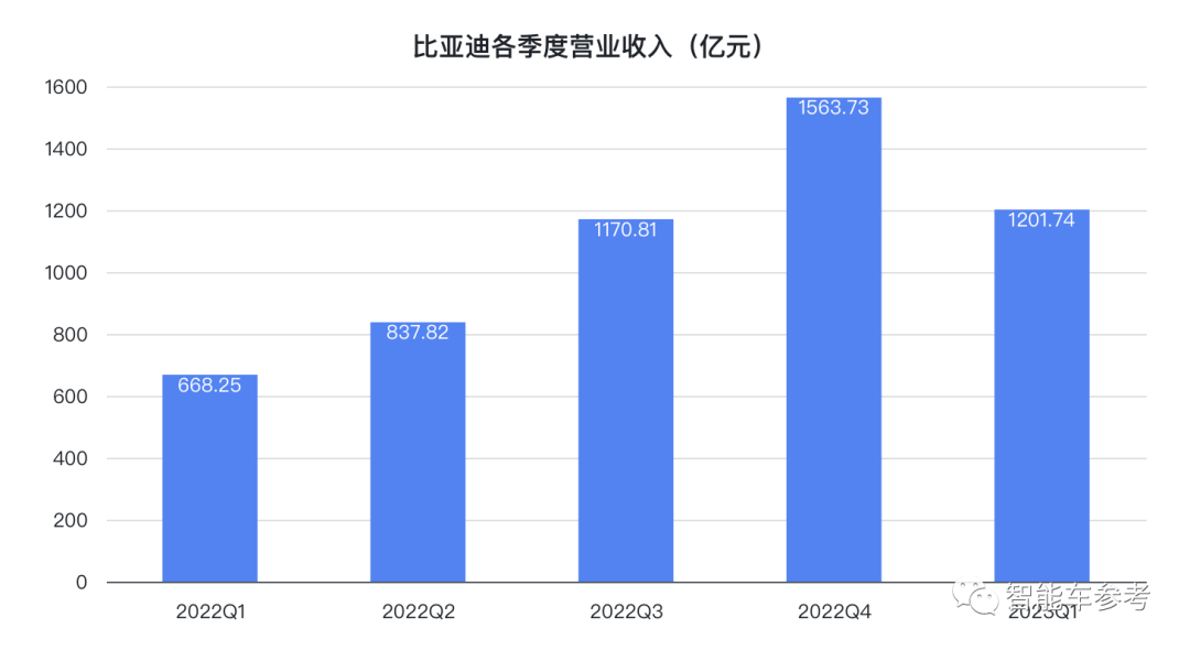 营业收入方面,一季度比亚迪营收1201.74亿元,同比增长79.83%,也是比亚迪连续第三个季度营收破千亿。