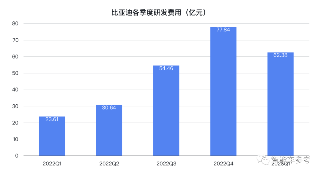 作为对比,2022年比亚迪全年研发投入为186.54亿元,今年Q1的研发投入已经达到2022全年的33.44%。