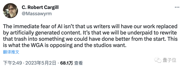 《奇异博士》的编剧Robert Cargill在社交媒体表示,可怕的不是工作被AI取代,而是编剧们将沦落到以极低的薪水改写AI生成的“垃圾”的田地,而人工创作本可以做得更好。
