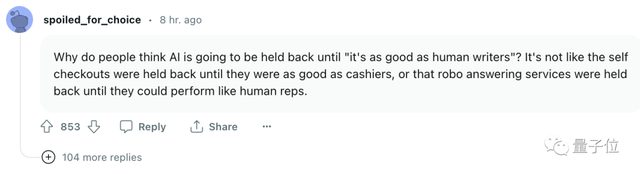 对于作家们的担心,有网友认为不无道理:尽管AI现在没办法完全替代编剧们的工作,但这并不妨碍AI被大规模地部署应用。