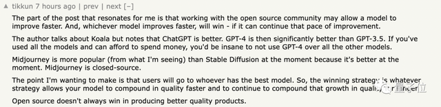 有网友认为,Sernau关于与开源社区合作可以让模型更快改进的观点值得认同。但其实无论是开源还是闭源,改进得快的那一方都将获胜。
