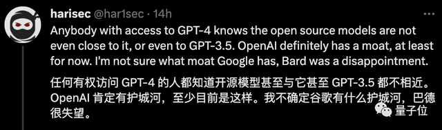 任何用过GPT-4的人都知道,开源模型与之相距甚远,甚至比不上GPT-3.5。OpenAI肯定有护城河,至少目前是这样。我不确定谷歌有没有,Bard反正是挺让人失望的。