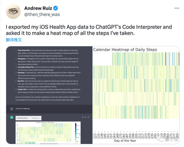 对此观点最好的例子,是一位网友把自己苹果健康的数据导出,并用此方法让ChatGPT生成了一张每天行走步数的热度图。