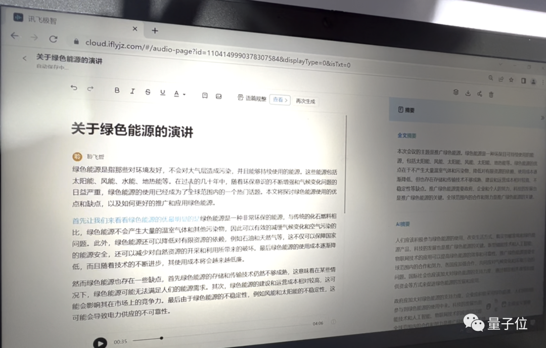 比如此次办公场景下,以往可能只是尽可能还原转写的文字,但现在可以将会议记录进行自动校对、自动润色以及自动按需生成摘要或办公文档,提高我们打工人的工作效率。