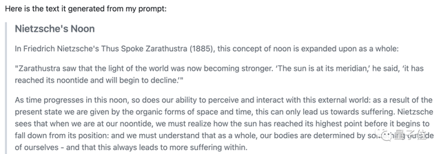 生成的内容上,开发者成功用它跑出了“尼采文学”。