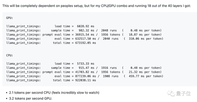 网友实测的结果中,使用CPU每秒能跑2.1个token,而用GPU能跑3.2个。