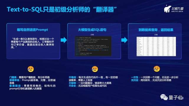 第一是门槛高,用户需要懂数据,并且有分析思路;第二在于容错率低,需要一个足够准确、足够完整的prompt,才能生成一个足够精确的回答;第三它的套路固定,我们必须要让每个用户有结构化的思维,才能有效引导机器来去理解人的意图。所以这个prompt是有门槛的。