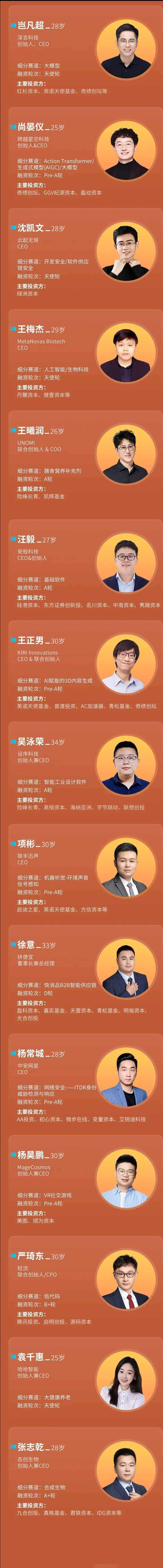 以下是本次“30 Under 30+创业先锋”和“40 Under 40 投资人”完整上榜名单: