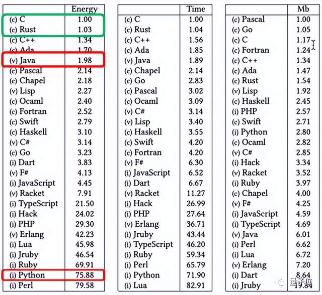 一项研究测试了27种编程语言,结果发现C和Rust在能源利用方面,比Java高效50%,比Python高效98%。
