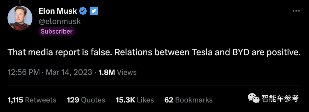 甚至在双方疑似叫停合作的新闻传出后,马斯克亲自下场辟谣:媒体的报道是假的,特斯拉与比亚迪的关系是真的,足以证明马斯克对这段关系的重视程度。